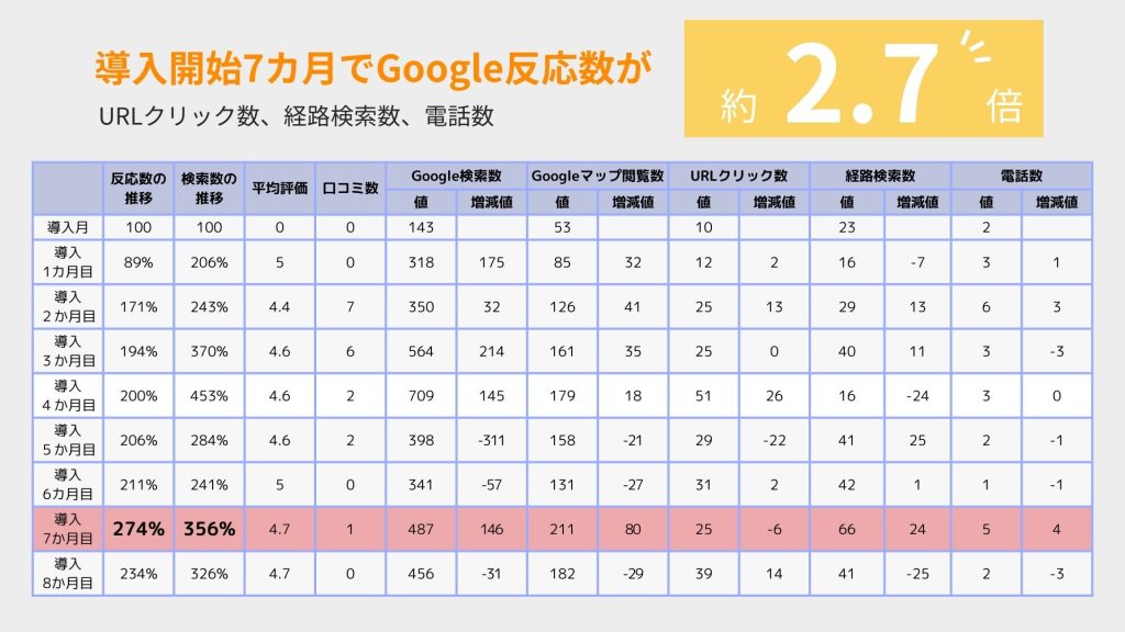導入効果:GoogleMap検索数453%増、閲覧数約4倍、高評価の維持